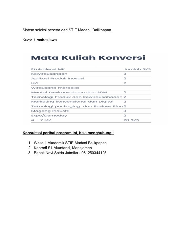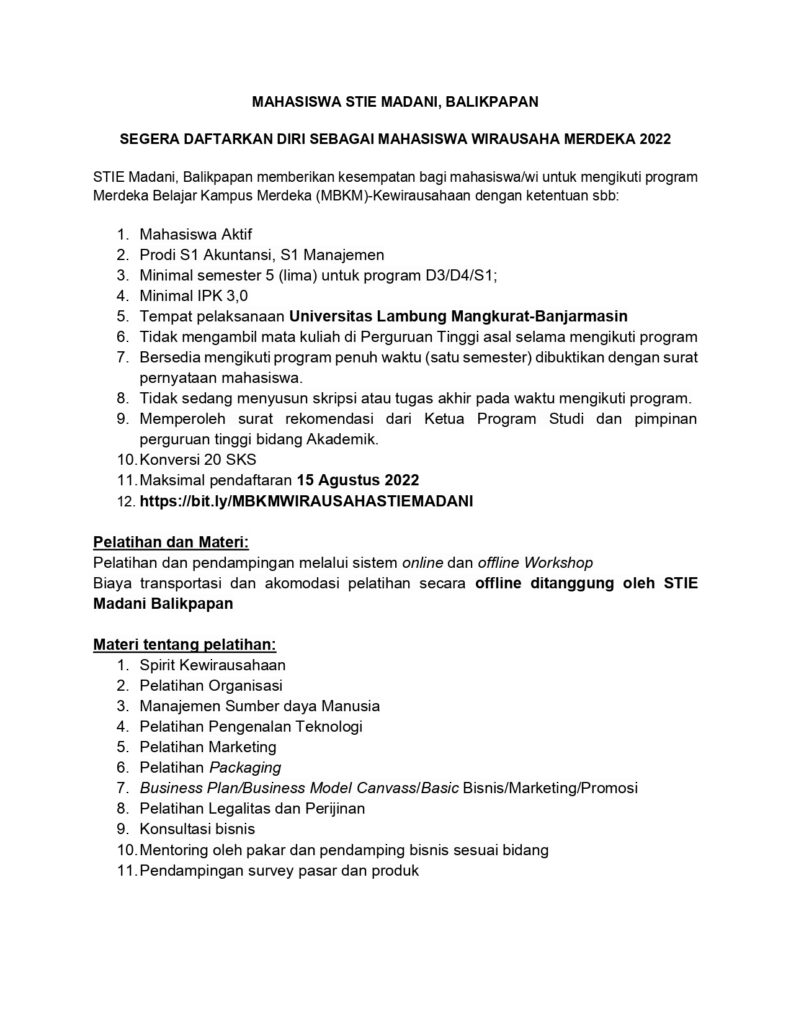 MBKM WIRAUSAHA MERDEKA STIE MADANI Post author: Post published:August 12, 2022 Post category:Info / Pengumuman Untuk pendaftaran bisa klik link berikut https://bit.ly/MBKMWIRAUSAHASTIEMADANI Post Views: 1,142 You Might Also Like List Dosen Wali Semester Ganjil Tahun Akademik 2022/2023 September 9, 2022 Daftar Nama Mahasiswa Yang Belum Mengambil Ijazah dan Transkrip Nilai May 24, 2022 Jadwal Kegiatan Belajar Mengajar Semester Ganjil Tahun Akademik 2023-2024 August 30, 2023