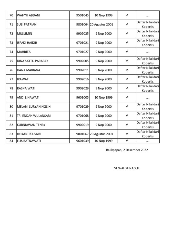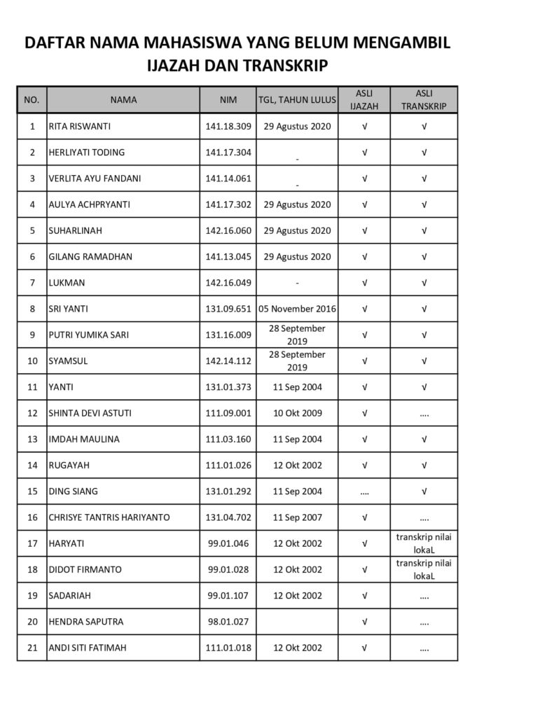 Daftar Nama Mahasiswa Yang Belum Mengambil Ijazah 2 Desember 2022 Post author: Post published:December 2, 2022 Post category:Info / Pengumuman Post Views: 873 You Might Also Like Pengumuman Beasiswa Pemkot Balikpapan June 13, 2020 Surat Edaran & Jadwal UAS Semester Genap Tahun Akademik 2024/2025 June 23, 2025 Pengumuman UTS Semester Genap 2023/2024 April 25, 2024