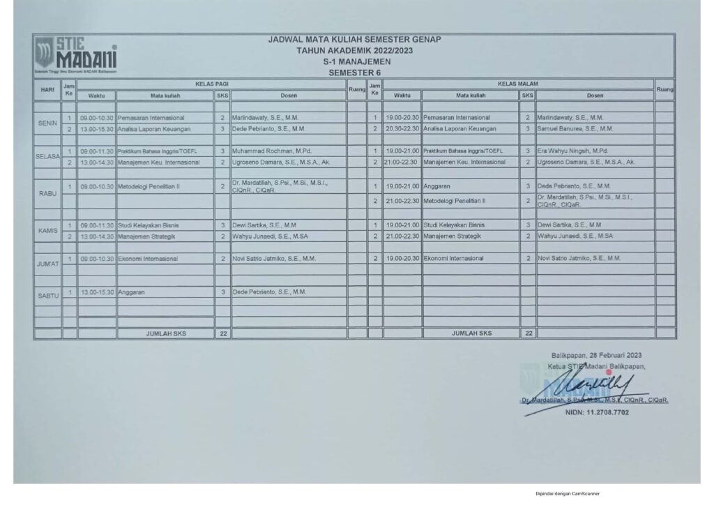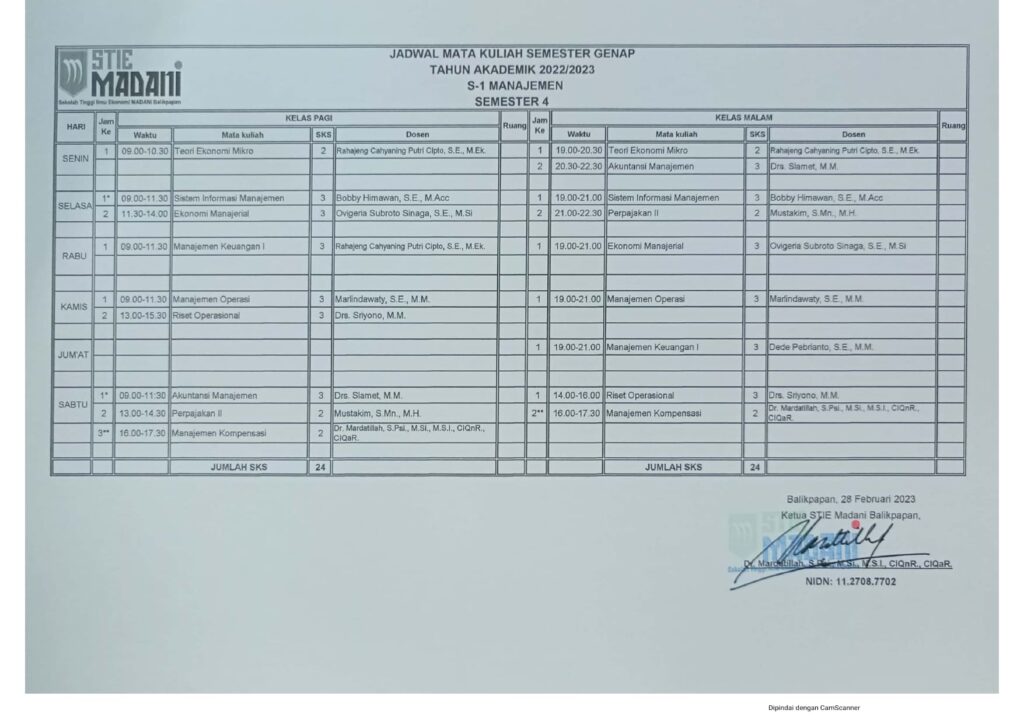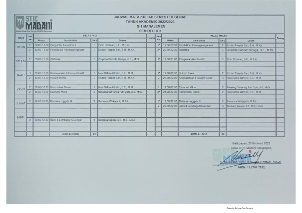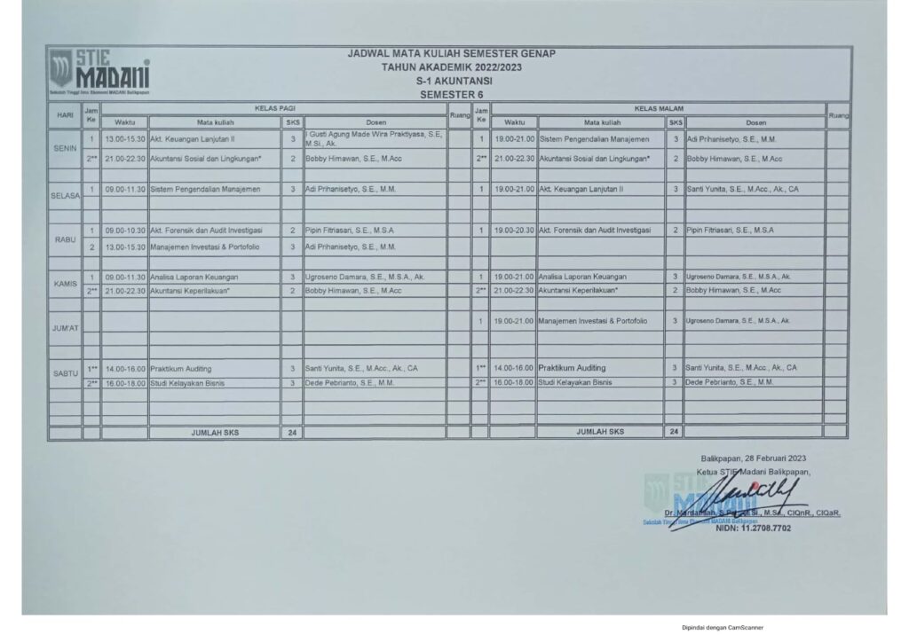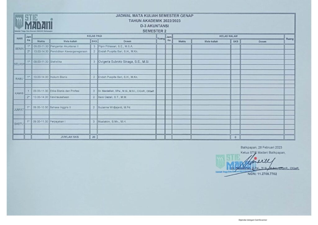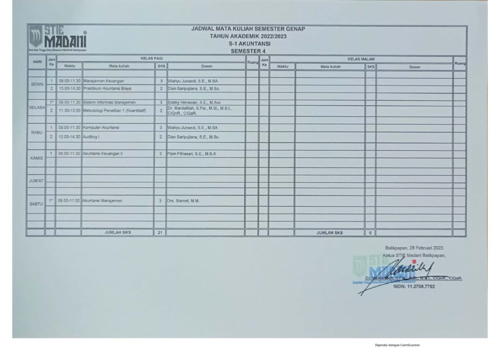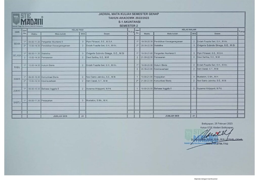 Jadwal Mata Kuliah Semester Genap Tahun Akademik 2022/2023 Post author: Post published:February 23, 2023 Post category:Info / Pengumuman D3 Akuntansi Semester 2 S1 Akuntansi Semester 2 S1 Manajemen Semester 2 S1 Akuntansi Semester 4 S1 Manajemen Semester 4 S1 Akuntansi Semester 6 S1 Manajemen Semester 6 Post Views: 432 You Might Also Like Pengajar dan Pengurus April 6, 2016 Selamat & Sukses atas terpilihnya Ibu Mardatillah, S.Psi., M.Si, M.S.I. sebagai Ketua STIE MADANI Balikpapan periode 2020 – 2024 August 28, 2020 PEMBERITAHUAN UTS SEMESTER GANJIL 2023/2024 October 16, 2023