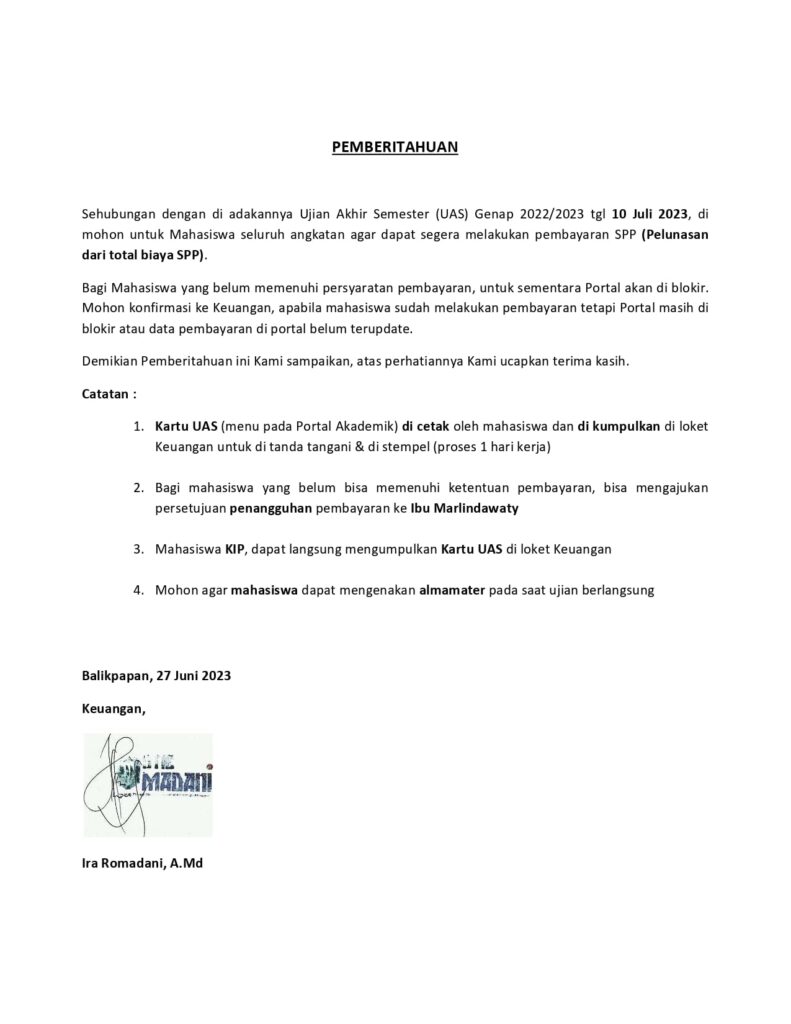 Pemberitahuan UAS Semester Genap 2022/2023 Post author:STIE Madani Post published:June 30, 2023 Post category:Info / Pengumuman Post Views: 648 You Might Also Like Persyaratan Semester Pendek (SP) January 20, 2021 PI PRODI S1 AKUNTANSI DAN S1 MANAJEMEN TAHUN 2016 January 13, 2020 Pengumuman July 24, 2020