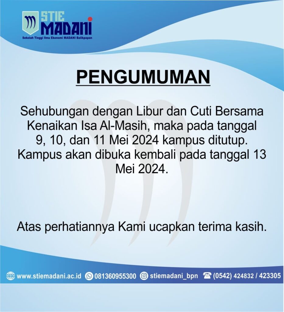 Pengumuman Libur & Cuti Bersama Kenaikan Isa Al Masih Post author:STIE Madani Post published:May 8, 2024 Post category:Berita / Pengumuman Post Views: 509 You Might Also Like Pengumuman Libur Idul Adha 2022 July 8, 2022 Pemberitahuan Perubahan Jadwal UTS Semester Genap Tahun Akademik 2023/2024 May 3, 2024 Telah dibuka Penerimaan Mahasiswa Baru STIE MADANI TA 2022-2023 December 5, 2022